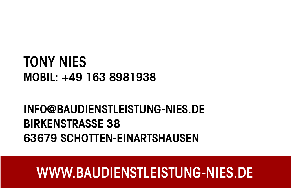 Diese Homepage befindet sich gerade im Umbau. Danke für Ihr Verständnis. Angaben gemäß § 5 TMGGeschäfts- und Postadresse:Baudienstleistung NiesBirkenstraße 3863679 SchottenTelefon: 0163-8981938E-Mail: info@baudienstleistung-nies.deSitz der Gesellschaft: 63679 SchottenGeschäftsinhaber: Tony Robert Nies